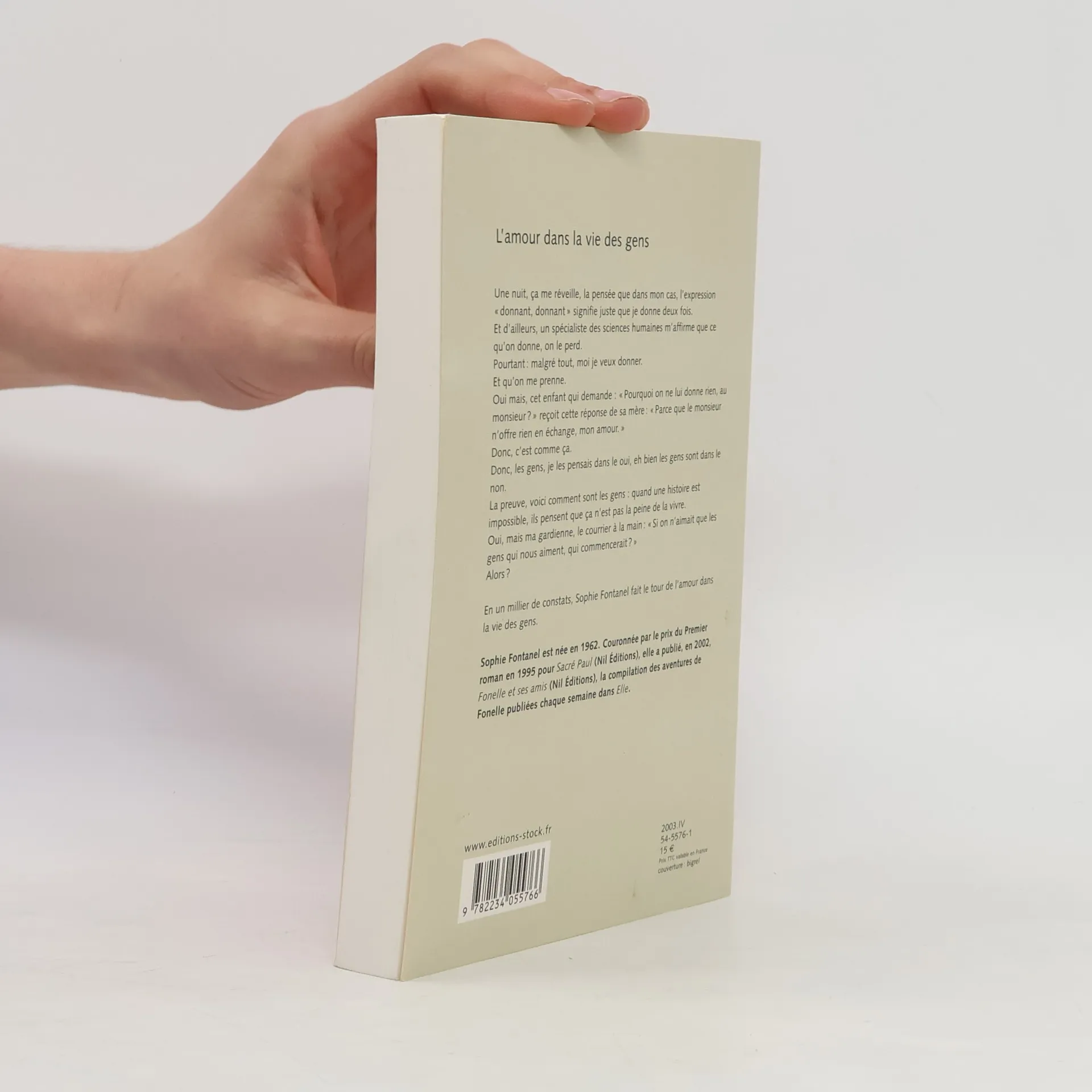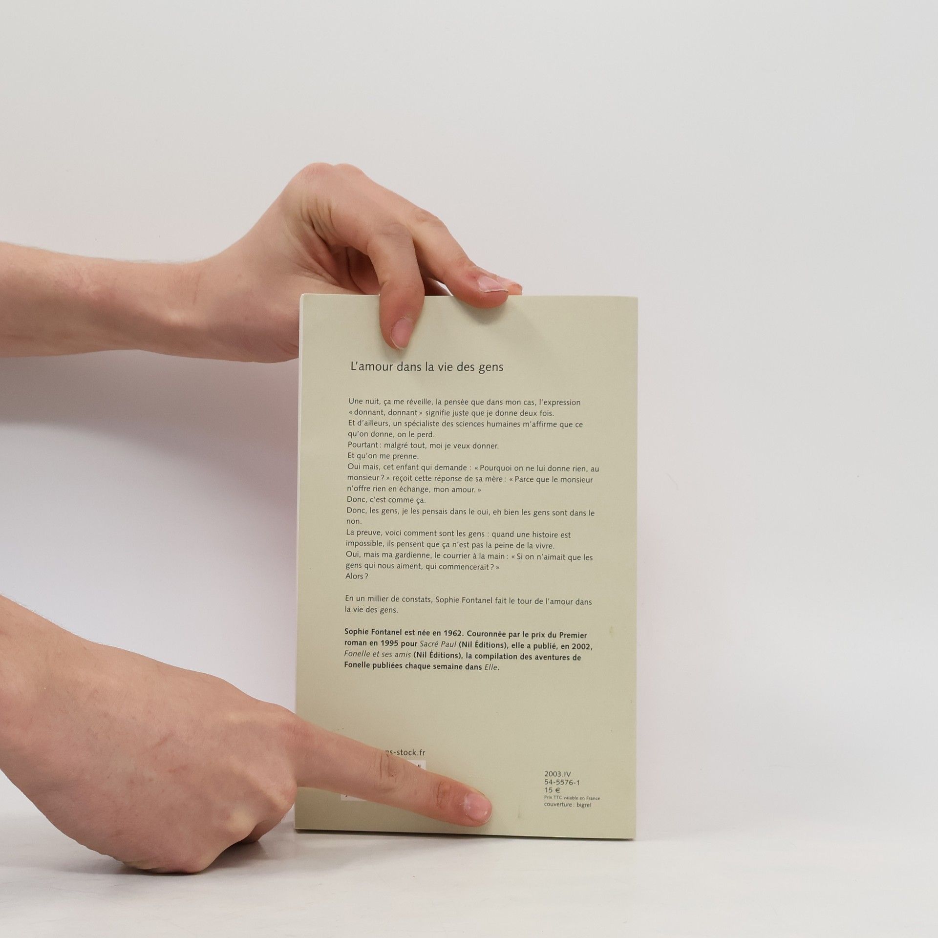 Une nuit, ça me réveille, la pensée que dans mon cas, l'expression " donnant, donnant " signifie juste que je donne deux fois. Et d'ailleurs, un spécialiste des sciences humaines m'affirme que ce qu'on donne, on le perd. Pourtant : malgré tout, moi je veux donner. Et qu'on me prenne. Oui mais, cet enfant qui demande : " Pourquoi on ne lui donne rien, au monsieur ? " reçoit cette réponse de sa mère : " Parce que le monsieur n'offre rien en échange, mon amour. " Donc, c'est comme ça. Donc, les gens, je les pensais dans le oui, eh bien les gens sont dans le non. La preuve, voici comment sont les gens : quand une histoire est impossible, ils pensent que ça n'est pas la peine de la vivre. Oui, mais ma gardienne, le courrier à la main : " Si on n'aimait que les gens qui nous aiment, qui commencerait ? " Alors ? En un millier de constats, Sophie Fontanel fait le tour de l'amour dans la vie des gens.