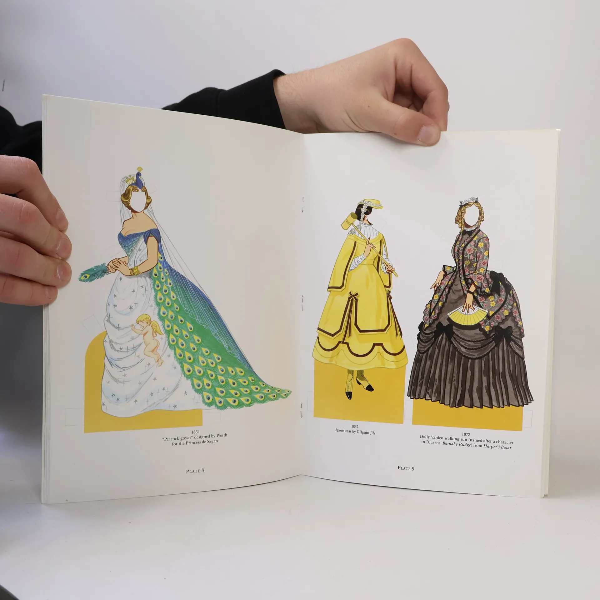Detailed, accurate renderings of 2 dolls, 28 costumes — Queen Victoria's wedding gown, evening dress by Worth, Dolly Varden walking suit, more.