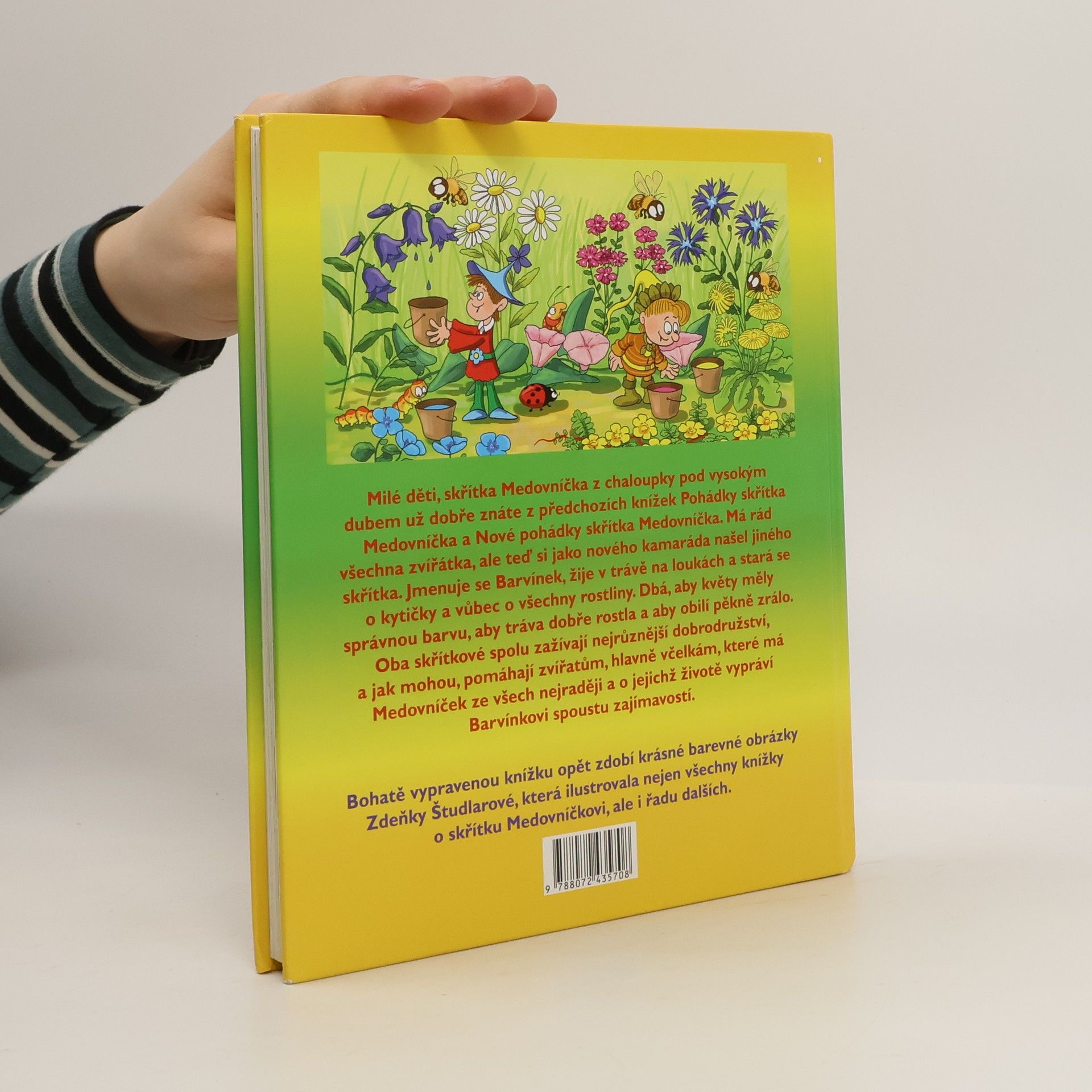 Milé děti, skřítka Medovníčka z chaloupky pod vysokým dubem už dobře znáte z předchozích knížek Pohádky skřítka Medovníčka a Nové pohádky skřítka Medovníčka. Ten má rád všechna zvířátka, ale teď si jako nového kamaráda našel jiného skřítka. Jmenuje se Barvínek, žije v trávě na loukách a stará se o kytičky a vůbec o všechny rostliny. Dbá, aby květy měly správnou barvu, aby tráva dobře rostla a také aby obilí pěkně zrálo ve slunci. Oba skřítkové spolu zažívají nejrůznější dobrodružství, a jak mohou, pomáhají zvířatům, hlavně včelám, které má Medovníček ze všech nejraději a o jejichž životě vypráví Barvínkovi spoustu zajímavostí. Dárkově vypravenou knížku opět zdobí krásné barevné obrázky Zdeňky Študlarové, která ilustrovala nejen všechny knížky o skřítku Medovníčkovi, ale i řadu dalších.
