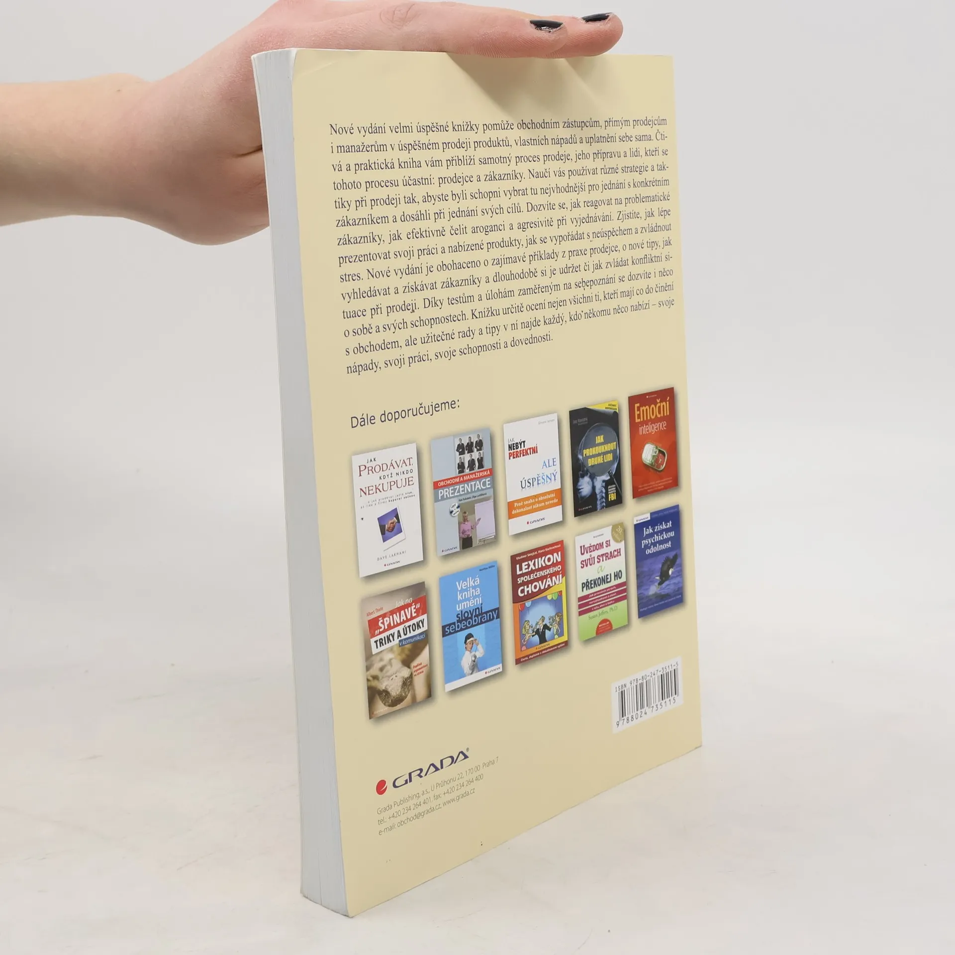 Nové vydání velmi úspěšné knížky pomůže obchodním zástupcům, přímým prodejcům i manažerům v úspěšném prodeji produktů, vlastních nápadů a uplatnění sebe sama. Čtivá a praktická kniha vám přiblíží samotný proces prodeje, jeho přípravu a lidi, kteří se tohoto procesu účastní: prodejce a zákazníky. Naučí vás používat různé strategie a taktiky při prodeji tak, abyste byli schopni vybrat tu nejvhodnější pro jednání s konkrétním zákazníkem a dosáhli při jednání svých cílů. Dozvíte se, jak reagovat na problematické zákazníky, jak efektivně čelit aroganci a agresivitě při vyjednávání. Zjistíte, jak lépe prezentovat svoji práci a nabízené produkty, jak se vypořádat s neúspěchem a zvládnout stres. Nové vydání je obohaceno o zajímavé příklady z praxe prodejce, o nové tipy, jak vyhledávat a získávat zákazníky a dlouhodobě si je udržet či jak zvládat konfliktní situace při prodeji. Díky testům a úlohám zaměřeným na sebepoznání se dozvíte i něco o sobě a svých schopnostech. Knížku určitě ocení nejen všichni ti, kteří mají co do činění s obchodem, ale užitečné rady a tipy v ní najde každý, kdo někomu něco nabízí - svoje nápady, svoji práci, svoje schopnosti a dovednosti.