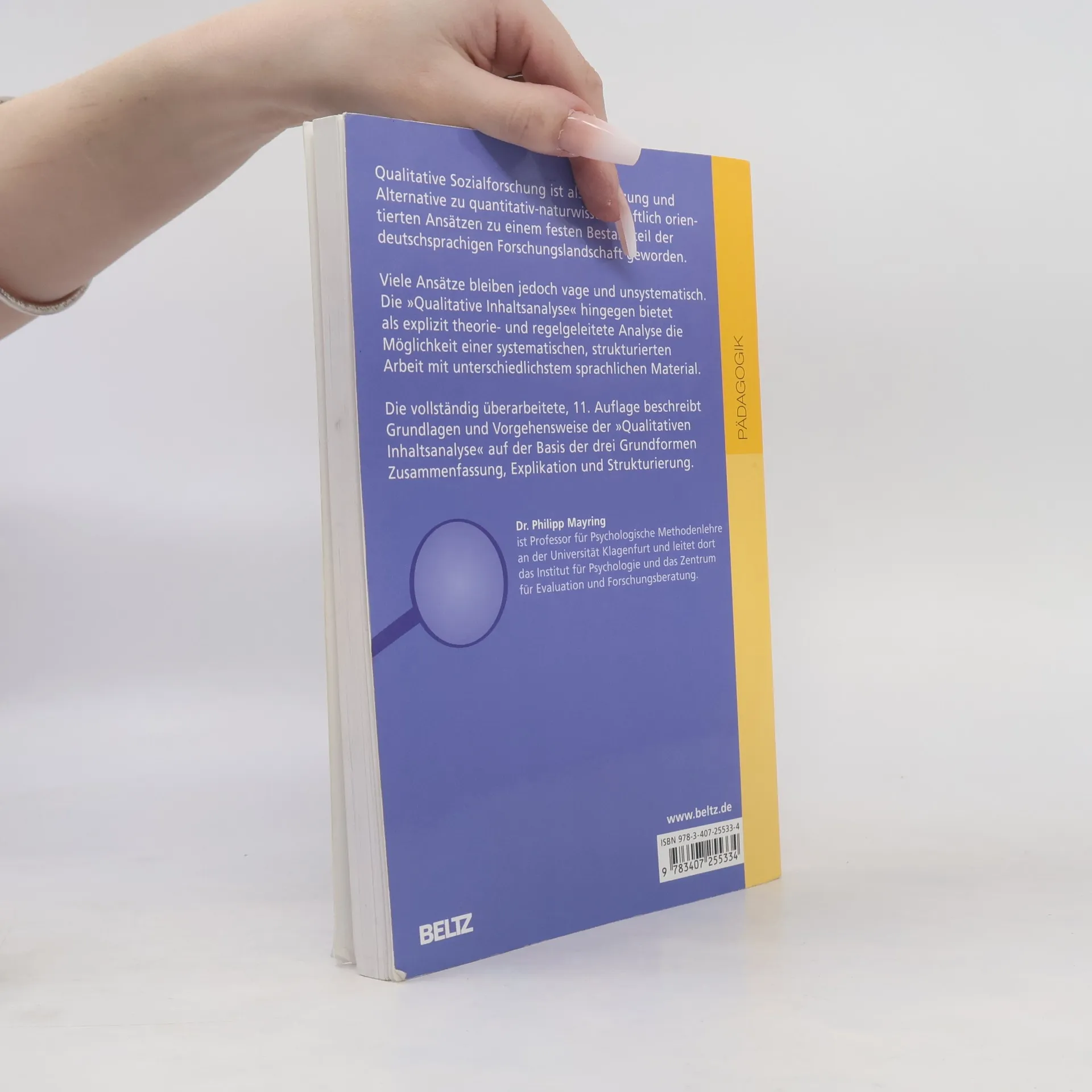 Viele Ansätze der 'Qualitativen Sozialforschung' bleiben vage, unsystematisch und schwer nachvollziehbar. Die 'Qualitative Inhaltsanalyse' hingegen bietet als explizit theorie- und regelgeleitete Analyse die Möglichkeit einer systematischen, strukturierten Arbeit mit unterschiedlichstem sprachlichen Material. Die überarbeitete 12. Auflage beschreibt Grundlagen und Vorgehensweise der 'Qualitativen Inhaltsanalyse' auf der Basis der drei Grundformen Zusammenfassung, Explikation und Strukturierung.