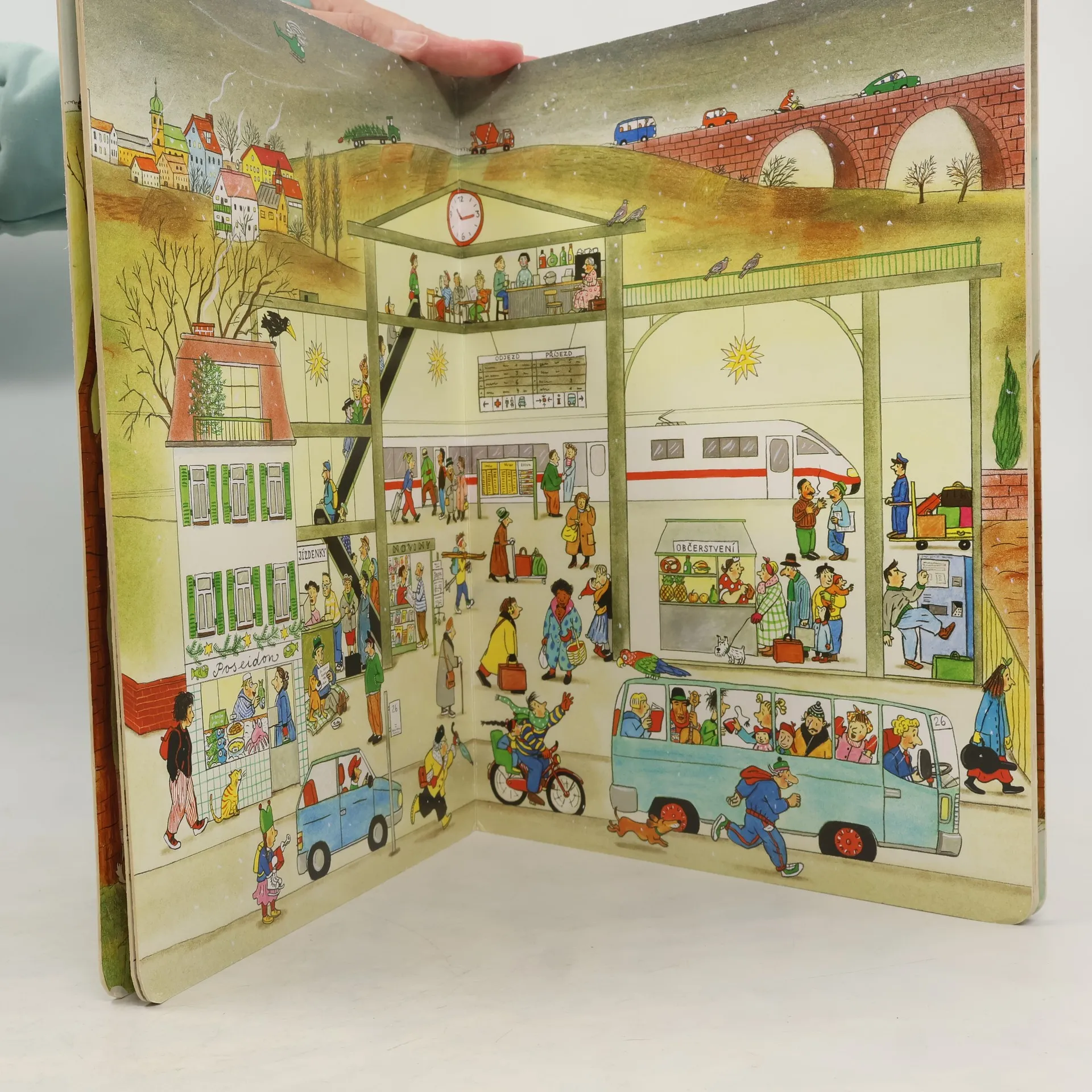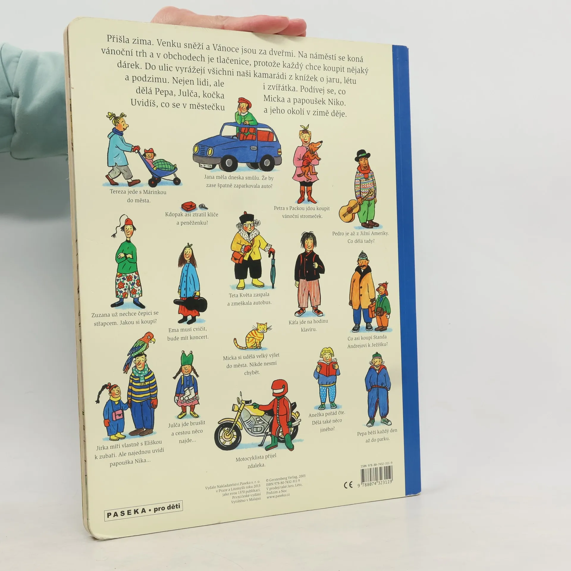Po knížce o jaru, létu a podzimu přichází Zima. Rotraut Suzanne Bernerová na obrázcích znovu vypráví své malé, vtipné příběhy všedního dne, které poutají a bystří pozornost, podněcují fantazii a řečové schopnosti, ale hlavně baví malé i větší děti. V předvánoční atmosféře se opět setkáte s některými starými známými a kamarády z předchozích tří úspěšných knížek. Přibudou další postavy, věci a zvířátka. Jen místo zůstává stejné: město s ulicemi, domy, s tržištěm, obchody, k tomu park a nedaleký statek. Podívejte se, co všechno se v Zimě děje!