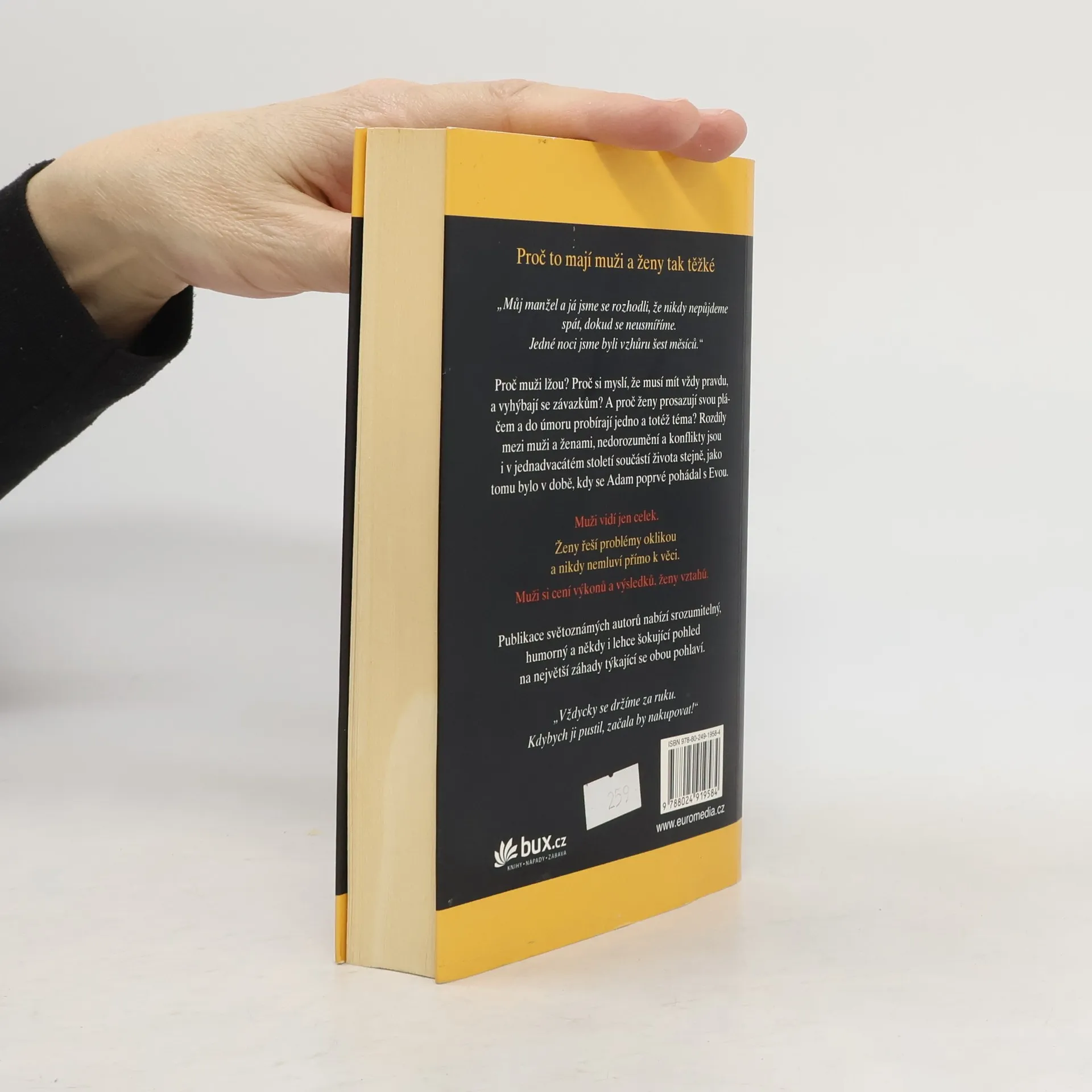 Proč muži lžou? Proč si myslí, že musí mít vždy pravdu, a vyhýbají se závazkům? A proč ženy prosazují svou pláčem a do úmoru probírají jedno a totéž téma? Rozdíly mezi muži a ženami, nedorozumění a konflikty jsou i v jednadvacátém století součástí života stejně, jako tomu bylo v době, kdy se Adam poprvé pohádal s Evou. Publikace světoznámých autorů nabízí srozumitelný, humorný a někdy i lehce šokující pohled na největší záhady týkající se obou pohlaví.