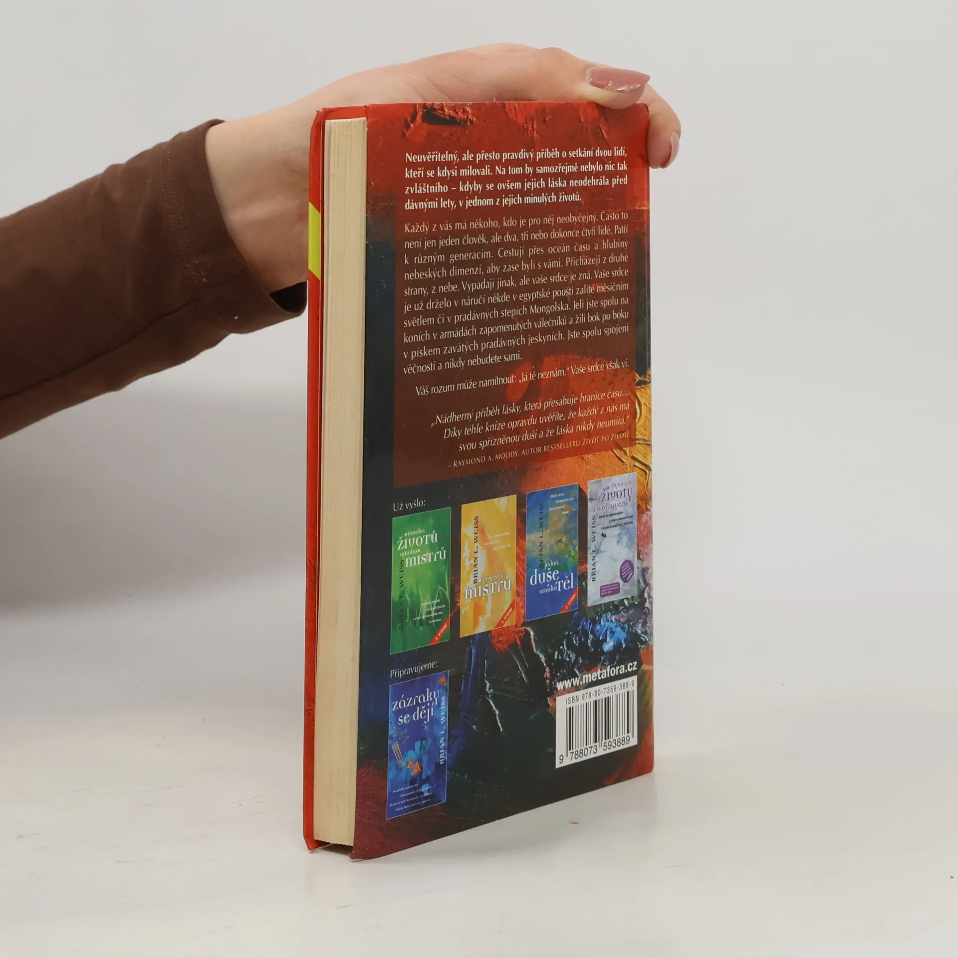 Ve filmech, v románech, ale i v životě si lidé občas slibují lásku „dokud nás smrt nerozdělí“. Jenže co když je smrt jen další branou, dveřmi otevřenými k novým zrozením a novým setkáním se svými milovanými? Dr. Weiss je nezvratně přesvědčen, že tomu tak opravdu je. Proč? Do jeho ordinace, kde pomáhá lidem metodou regresní terapie, přišla mladá žena Elizabeth. Po matčině smrti trpěla nesmírným zármutkem, měla problémy i se vztahy k mužům. Dr. Weiss ji zavedl do minulých životů, aby se společně pokusili odhalit příčinu. Ve stejné době se u něj léčil Pedro, sympatický Mexičan, který se také utápěl v žalu. Elizabeth s Pedrem se neznali, takže nikdo netušil, jak neuvěřitelné drama se začíná rozehrávat. Čím hlouběji se totiž nořili do minulosti, tím jasnější se zdálo, že se kdysi velice dobře znali, a co víc, že se milovali! Na lékaři teď bylo těžké rozhodnutí. Má bývalým milencům prozradit pravdu o jejich minulých životech? Má právo zasáhnout do toho současného? Neuvěřitelné svědectví o tom, že naši milovaní nás nikdy neopustí… Od autora již vyšlo: Mnoho životů, mnoho Mistrů, Poselství Mistrů, Jedna duše, mnoho těl