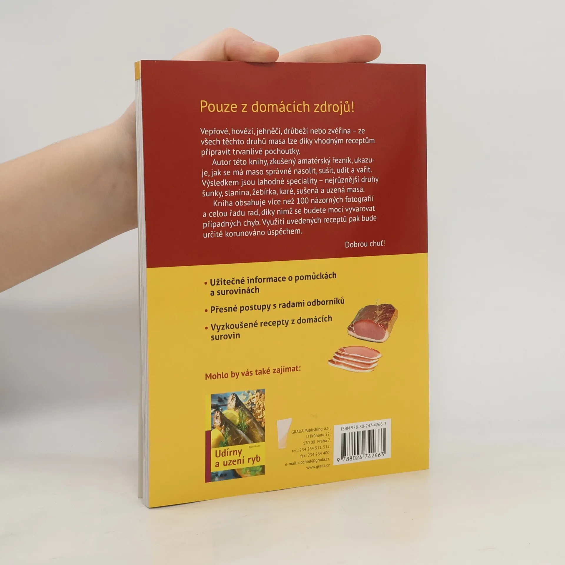Vepřové, hovězí, jehněčí, drůbeží nebo zvěřina - ze všech těchto druhů masa lze díky vhodným receptům připravit domácí trvanlivé pochoutky. Autor této knihy, zkušený amatérský řezník, ukazuje, jak se má maso správně nasolit, sušit, udit a vařit. Výsledkem jsou lahodné speciality - nejrůznější druhy šunky, slanina, žebírka, karé, sušená a uzená masa. Věnuje se také správnému konzervování. Kniha obsahuje více než 100 názorných fotografií a celou řadu rad, díky nimž se budete moci vyvarovat případných chyb. Využití uvedených receptů, přesných postupů a rad odborníků pak bude určitě korunováno úspěchem.