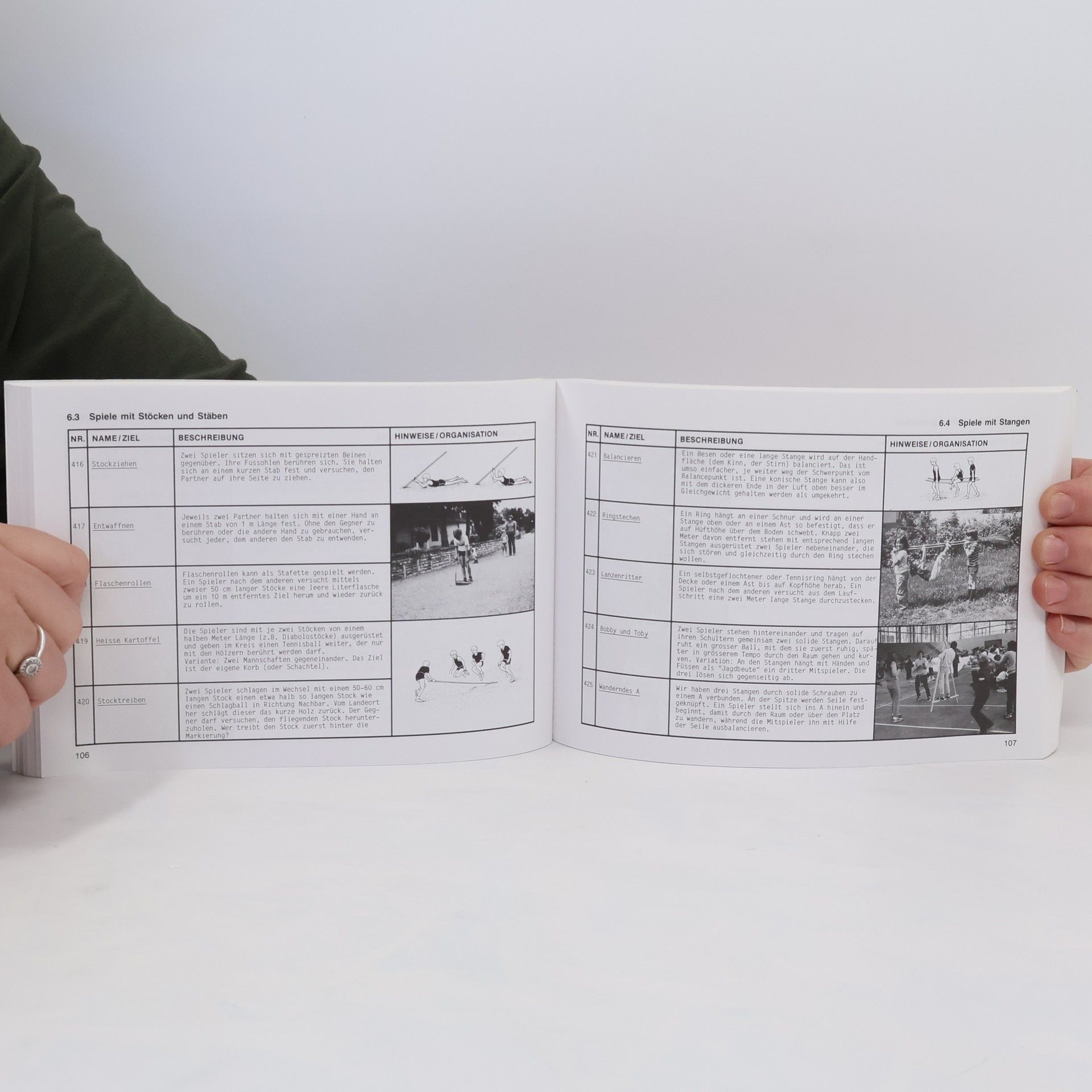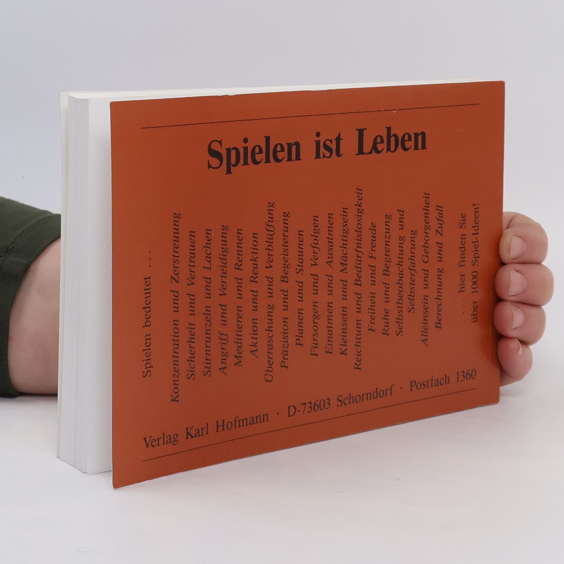 Spiel- und Übungsformen für verschiedene Gelegenheiten, mit den Sinnen und Elementen, mit Worten und Phantasie, mit Krimskrams, Wohlstandsmüll und Requisiten, mit Medien, aus Holz, mit Hölzchen, Papier und Bleistift, mit Würfeln und Karten, mit alten und neuen Spielmitteln und für Partnerspiele und Bewegungsspiele.