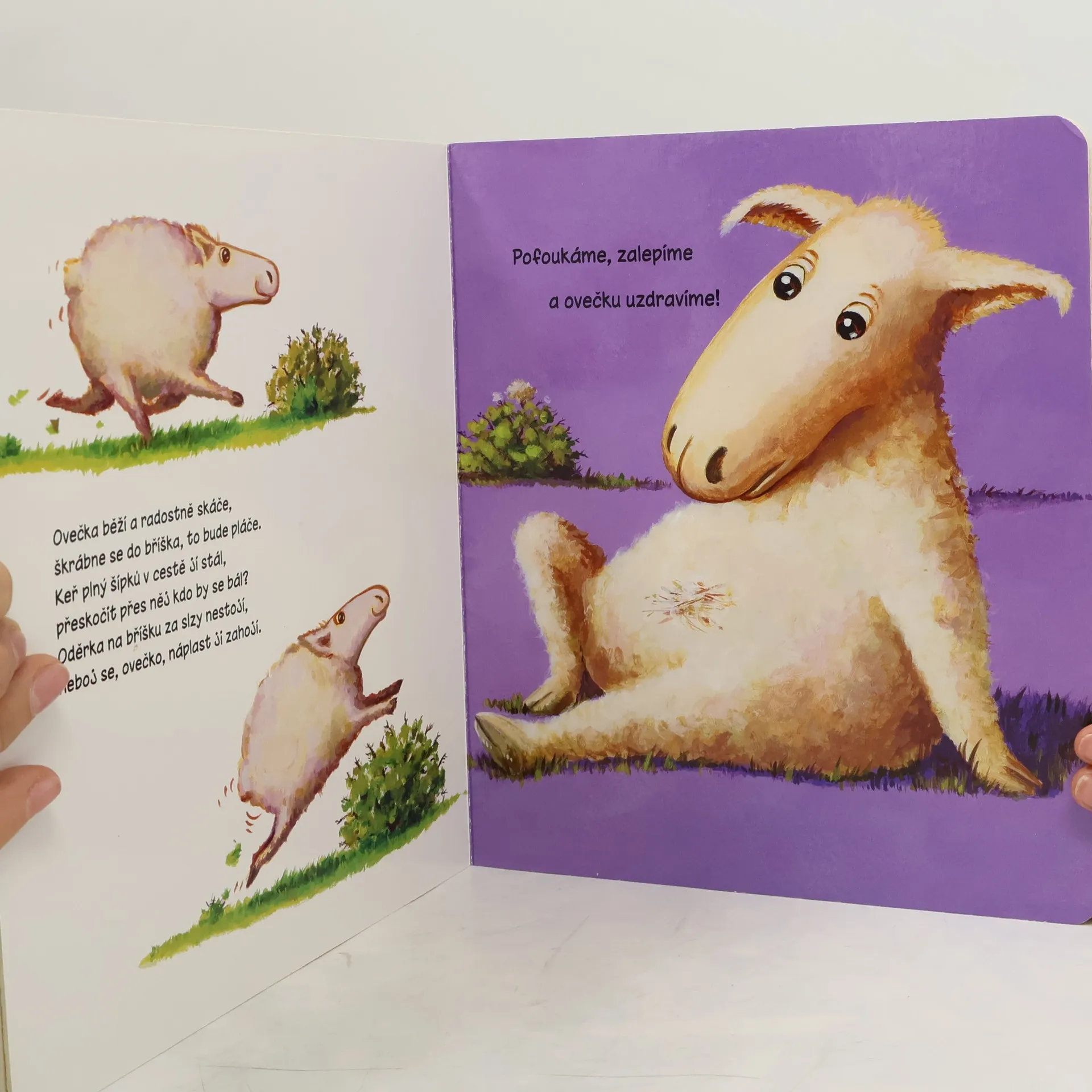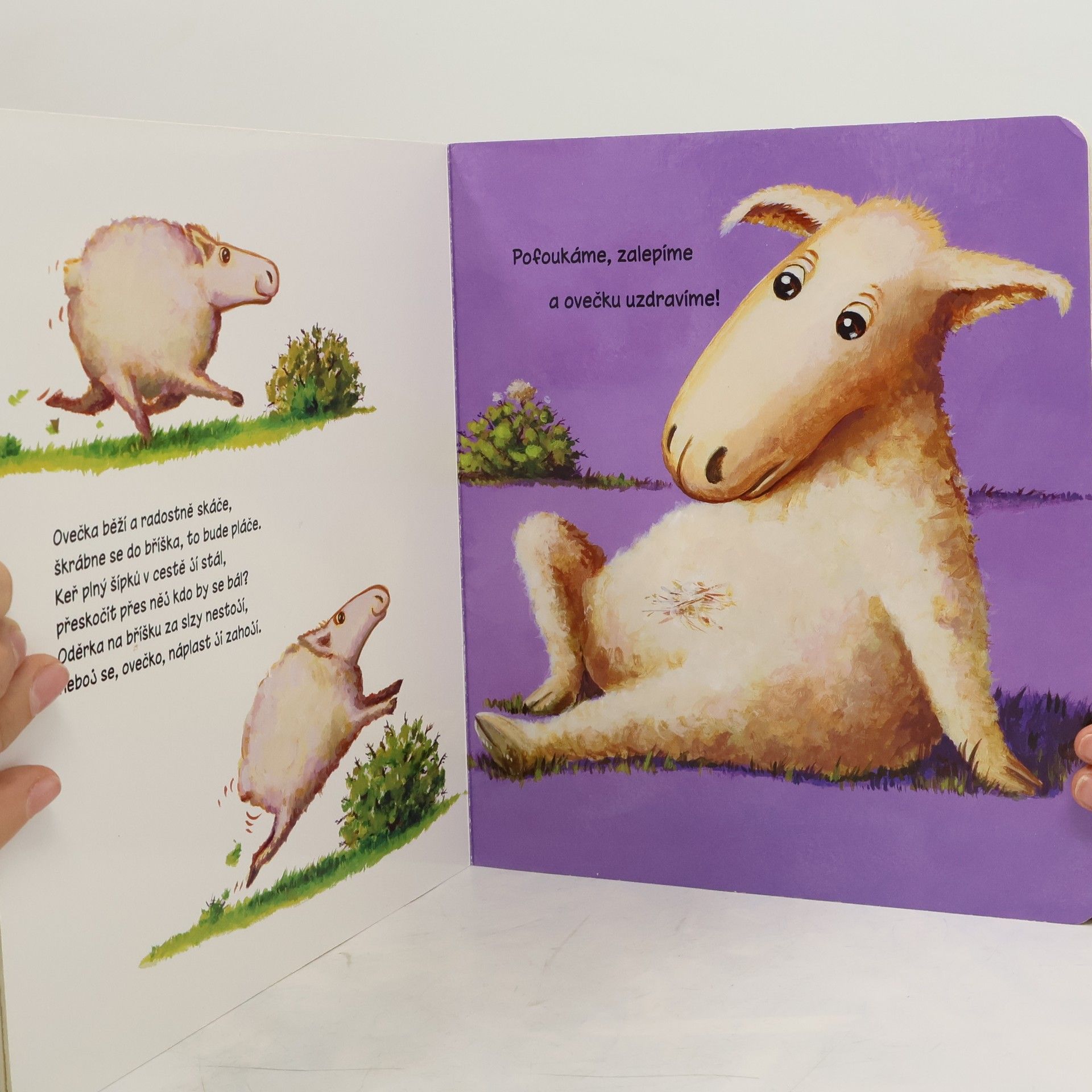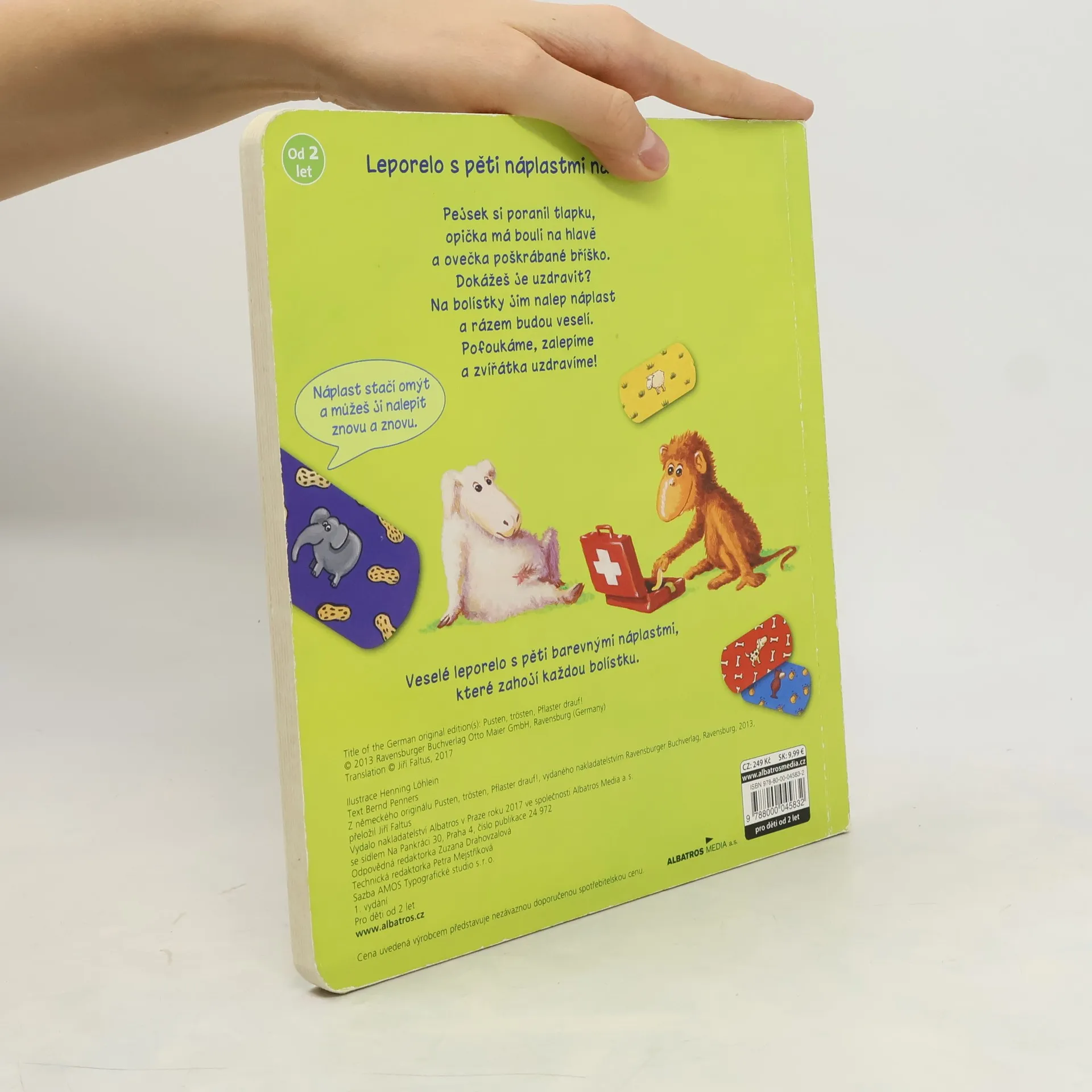 Pejsek si poranil tlapku, opička má bouli na hlavě a ovečka poškrábané bříško. Dokážeš je uzdravit? Na bolístky jim nalep náplast a rázem budou veselí. Pět barevných náplastí stačí omýt vodou a můžeš je nalepit znovu a znovu. Nakladatelská anotace.