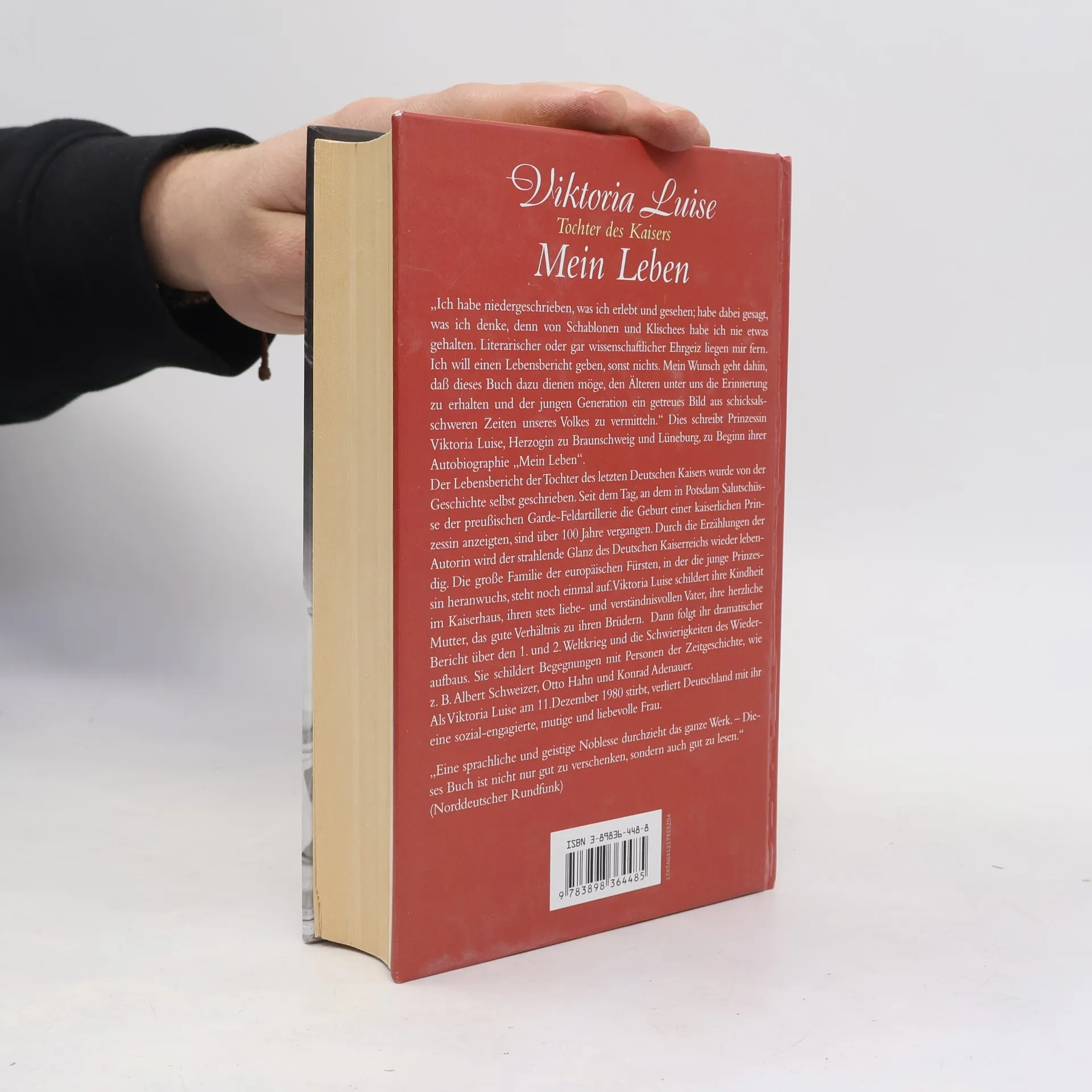 Der Lebensbericht der Tochter des letzten Deutschen Kaisers wurde von der Geschichte selbst geschrieben. Seit dem Tag, an dem in Potsdam Salutschüsse der preußischen Garde-Feldartillerie die Geburt einer kaiserlichen Prinzessin anzeigten, sind über 100 Jahre vergangen. urch die erzählung der Autorin wird der strahlende Glanz des Deutschen Kaiserreichs wieder lebendig. Viktoria Luise schildert ihr Kindheit im Kaiserhaus, ihren stets liebe-und verständnisvollen Vater, ihre herzliche Mutter, das gute Verhältnis zu ihren Brüdern. Dann folgt ihr dramatischer Bericht über den 1. und 2. Weltkrieg und die Schwierigkeiten des Wierderaufbaus. Sie schildert Begegnungen mit Personen der Zeitgeschichte, wie z. B. Albert Schweizer, Otto Hahn und Konrad Adenauer. Als Viktoria Luise am 11. Dezember 1980 stirbt, verliert Deutschland mit ihr eine sozial-engagierte, mutige und liebevolle Frau