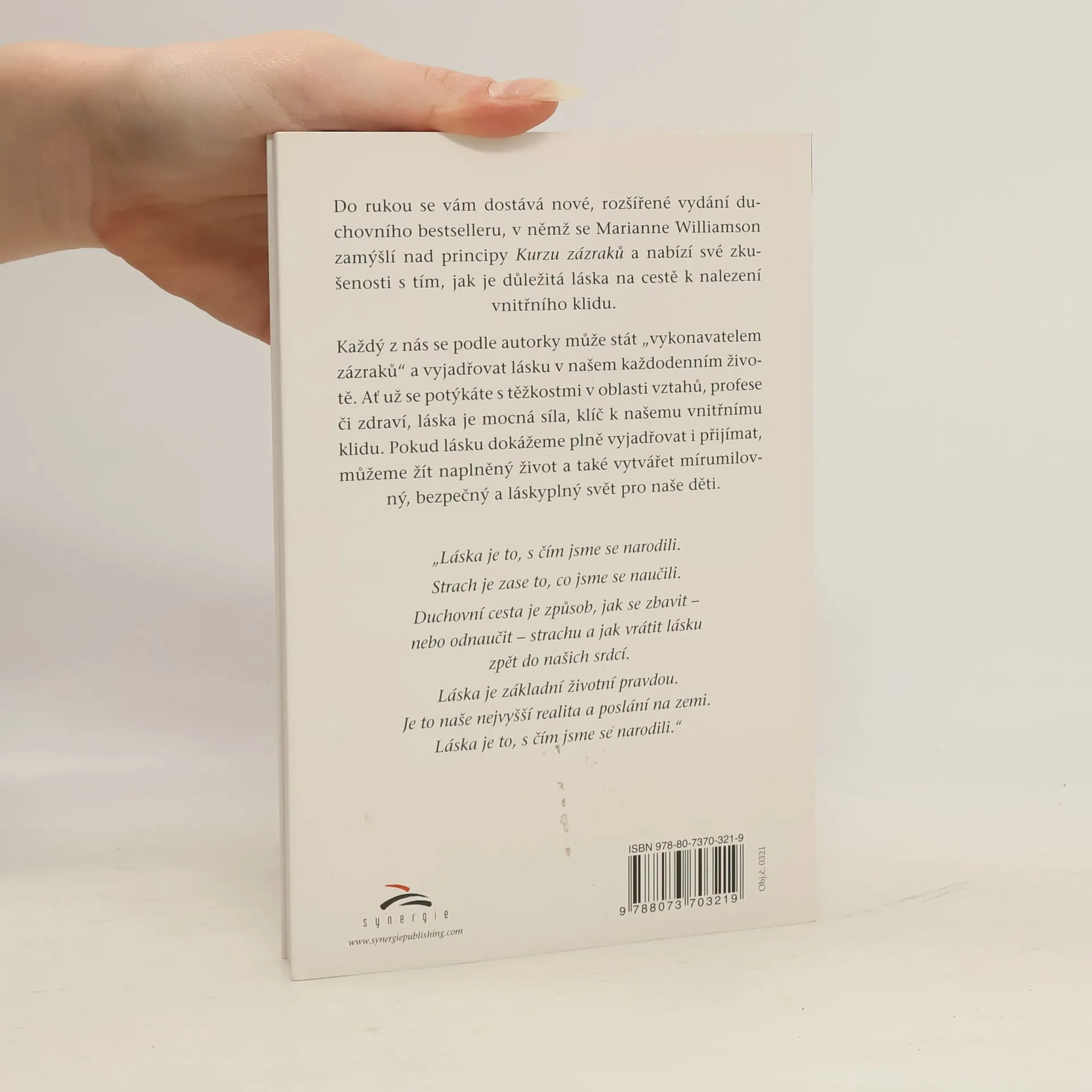 Nové, rozšířené vydání duchovního bestselleru, v němž Marianne Williamson sdílí své pochopení Kurzu zázraků, a své bohaté zkušenosti s aplikováním lásky na cestě k nalezení vnitřního klidu. O nezastupitelnosti lásky v jejím neosobním smyslu bylo již popsáno mnoho knih. Přesto je to téma stále aktuální. Opravdu hodně rozšířený nepřítel lásky - strach - má poměrně silné pozice. Často nás totiž paralyzuje způsobem do jisté míry neočekávaným: nemáme strach, že něco nedokážeme, ale strach, že něco dokážeme, a ten nám podvědomě zabraňuje cíle dosáhnout. Zamyslíte-li se nad touto úvahou, jistě na ní naleznete pravdivé jádro. A zde je právě úloha knihy, která nám pomáhá odkrýt zdroje našich obav a strachů. Popisuje zkušenosti s metodou individuální duchovní psychoterapie zvanou Kurz zázraků, kterou autorka zpracovala do podoby vhodné pro každého čtenáře přistupujícího ke studiu s otevřeným srdcem. Nechme se tedy inspirovat!