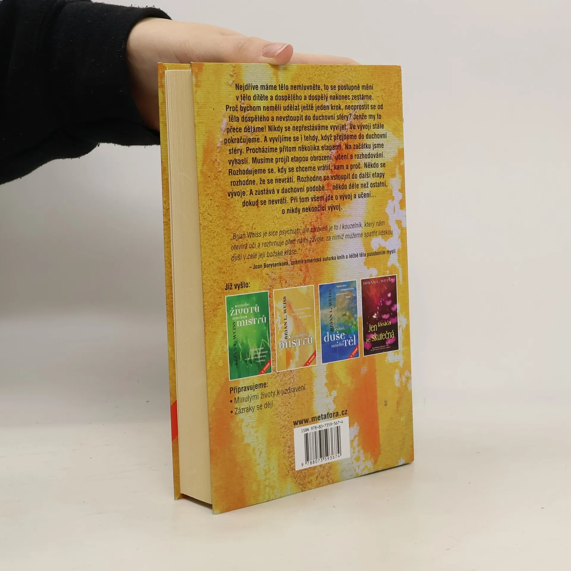Od autora bestsellerů Mnoho mistrů, mnoho životů a Jedna duše, mnoho těl Briana L. Weisse. Zatímco ve svých předešlých knihách se dr. Weiss zabýval spíš vlivem minulých životů na současné životy lidí, v tomto díle se zaměřil na nadčasové, blahodárné a vpravdě božské působení netělesných bytostí, jež jsou zasvěceným známé coby Mistři. Tito moudří duchovní průvodci bdí nad našimi osudy a je jen na každém z nás, zda se rozhodne jejich velkorysé nabídky využít. Pro každičkého člověka na této planetě má totiž planetě má totiž duchovní svět přichystáno nekonečné množství všemocné síly, jíž se v tomto vesmíru nic nevyrovná. Ta síla má jméno láska… O tom, že se nejedná o žádné naivní pohádky svědčí kromě nesporné vědecké prestiže autora také množství autentických výpovědí osob, které se podrobily regresi. Kniha proto obsahuje skutečná, přesná a doslovná poselství duchovních Mistrů, která byla při sezeních zaznamenána. Doplňují ji texty meditačních technik, které čtenář může s úspěchem vyzkoušet sám na sobě a otevřít si tak cestu ke zdroji nekonečné jednoty a síly. Učení duchovních Mistrů, hlas lásky volající přes propast světů. 3. vydání.